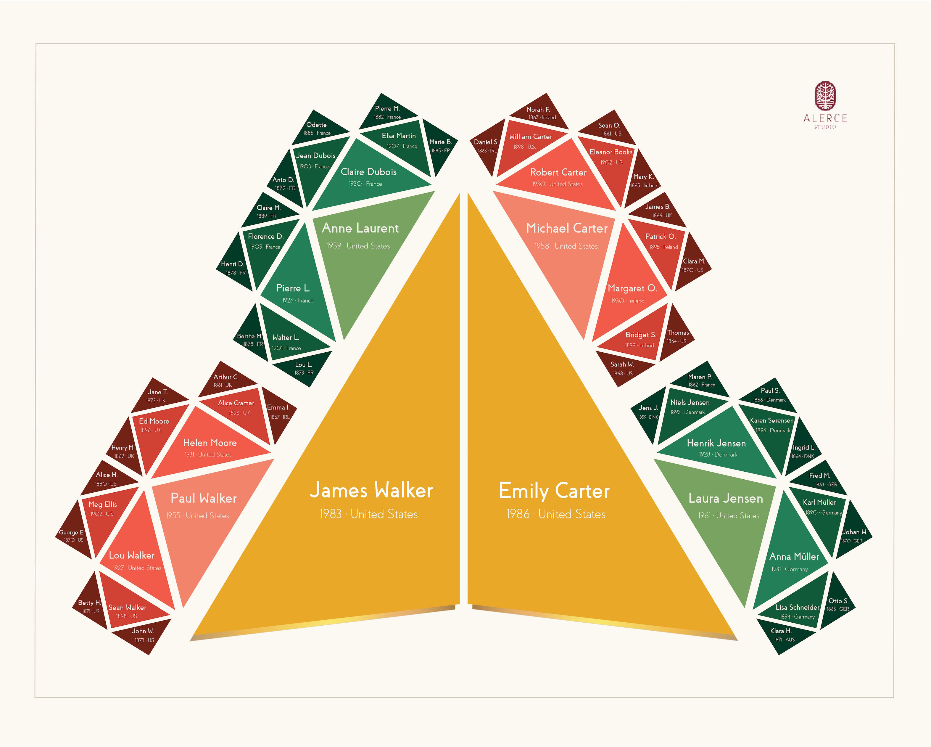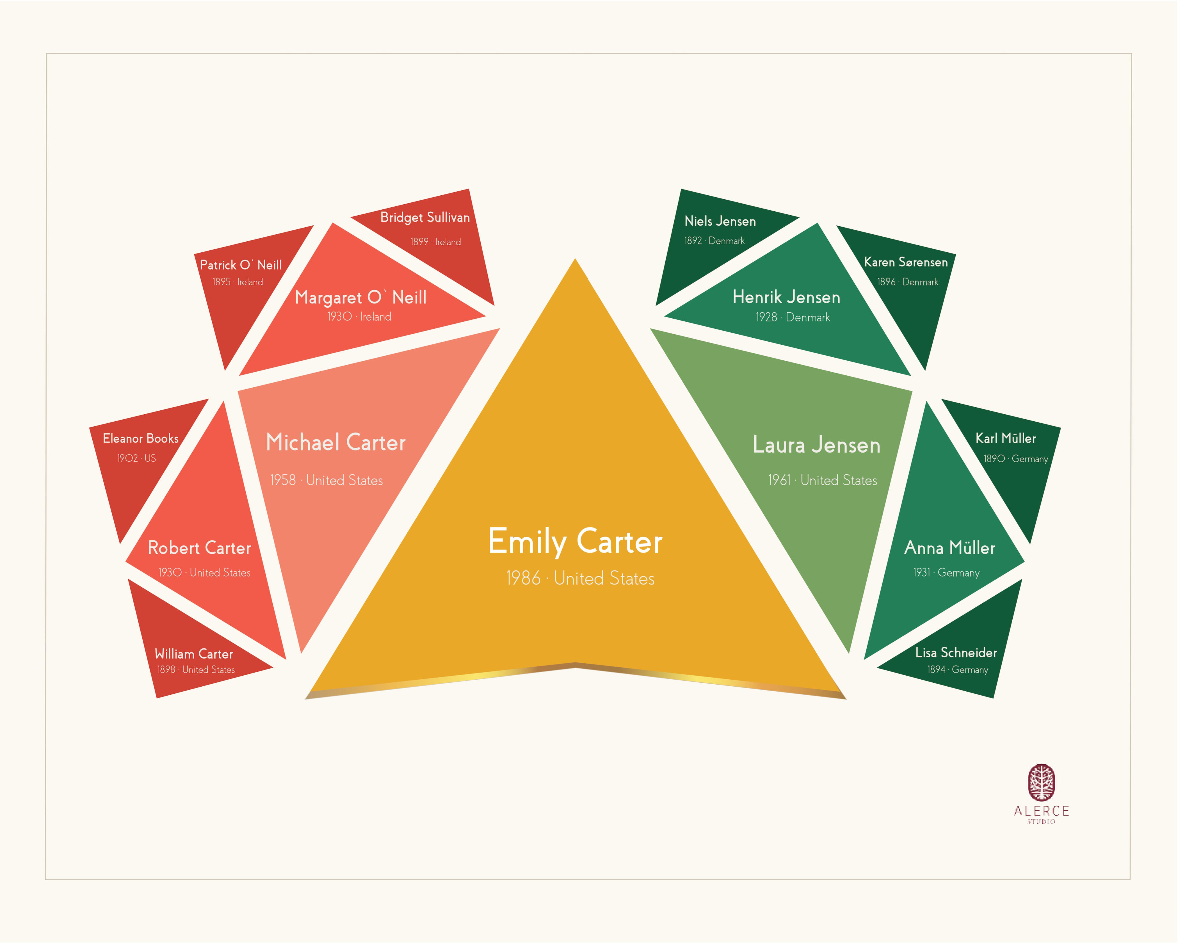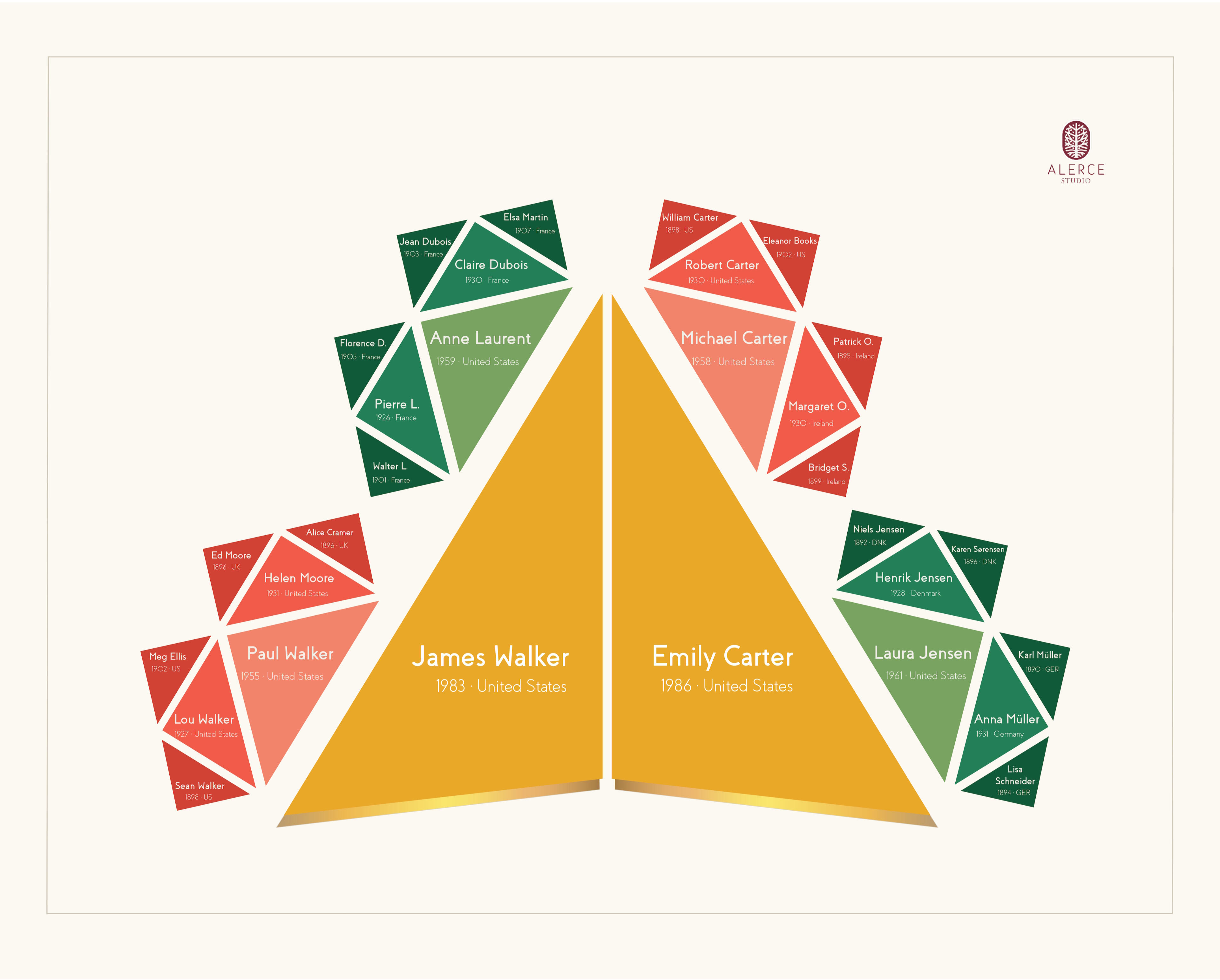 The most proportionate generational composition. A structure centered on one individual or one couple, extending to parents, grandparents, and great-grandparents.The most balanced and commissioned edition.